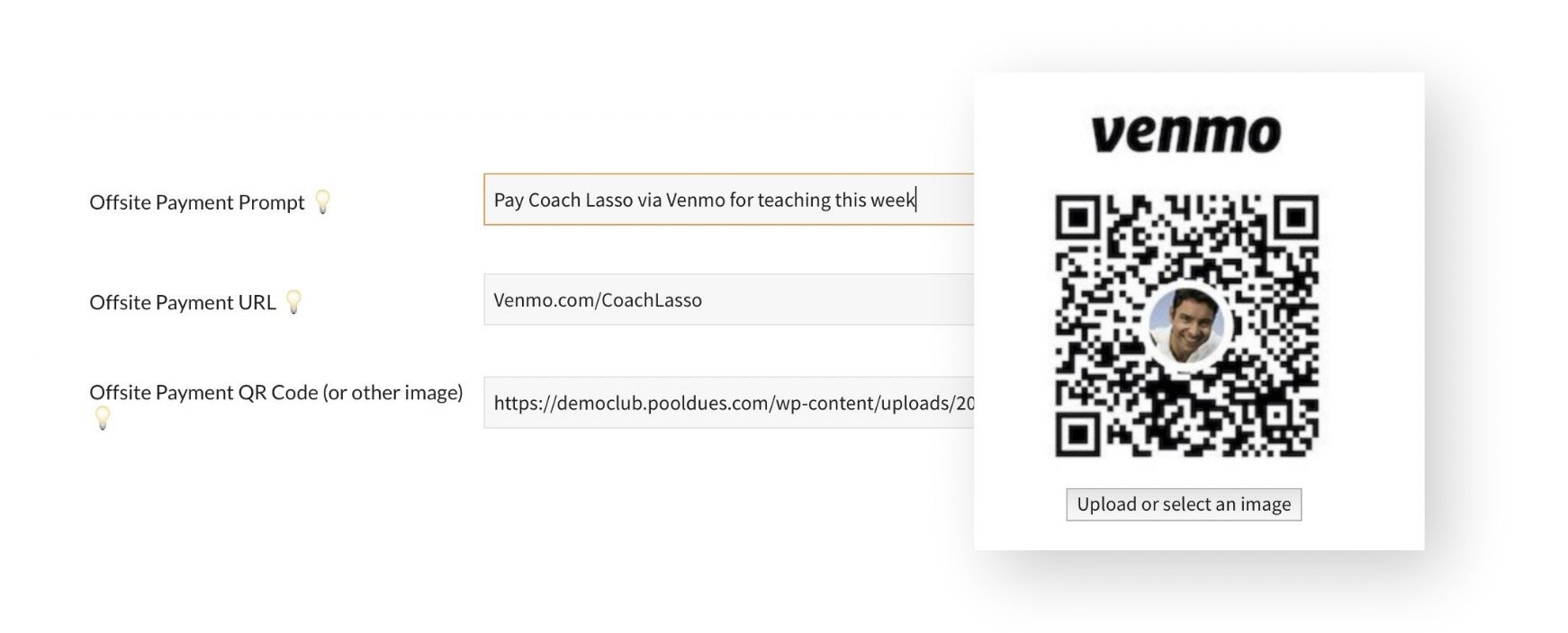 If offsite payments options are offered, the member is prompted to pay after signing up. The Sign-Up page will include the instructor’s payment link (to Venmo, CashApp, Paypal, etc), as well as an optional image, for example a QR code, and a payment prompt, such as “Pay Coach Lasso via Venmo for teaching this week”.