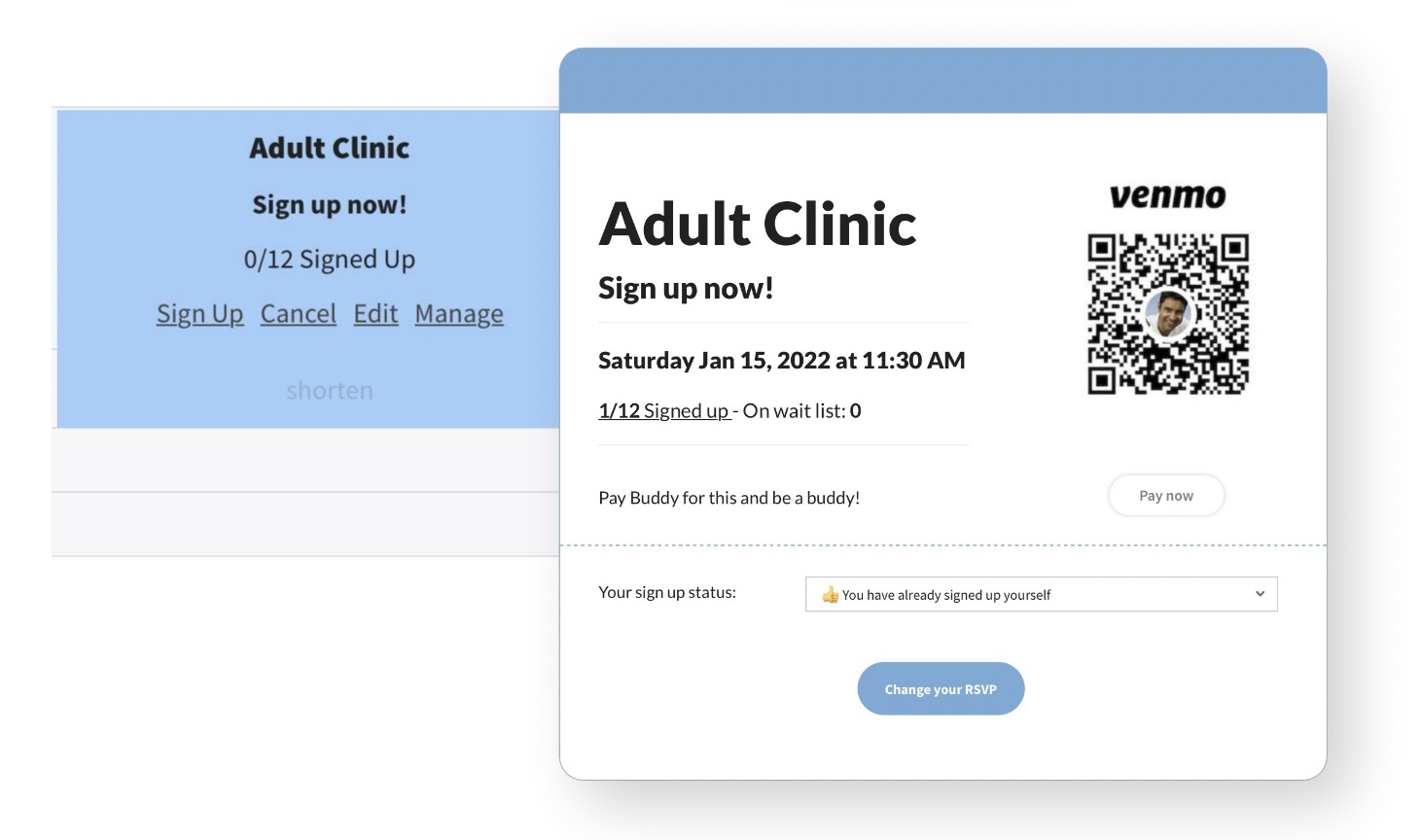 Alternatively, a Sign-Up can allow instructors to get paid off-site, using Venmo, CashApp, even cash. This feature is intended to give your club an easy way to host regular clinics without having to burden your volunteer Treasurer by paying out an instructor from money received through the website.