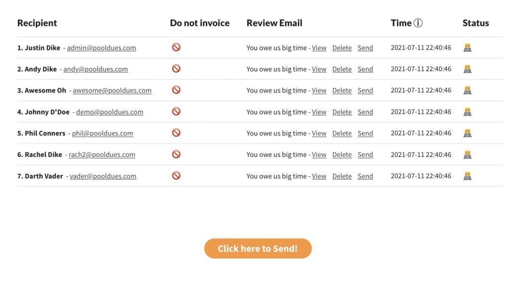 Once your email is ready, send it to the Review Queue. From here, you will see a list of every member that will receive your payment request. If everything looks good, press the send button.
