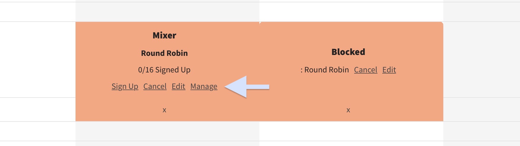 Approved users, like your tennis pros, can manage the your grid’s Sign-Up type reservations. When viewing the reservation on the grid one an admin-only “Manage” link appears…