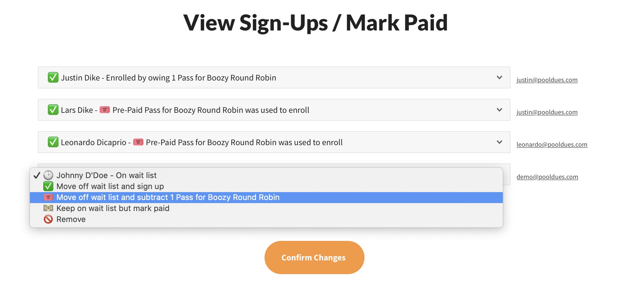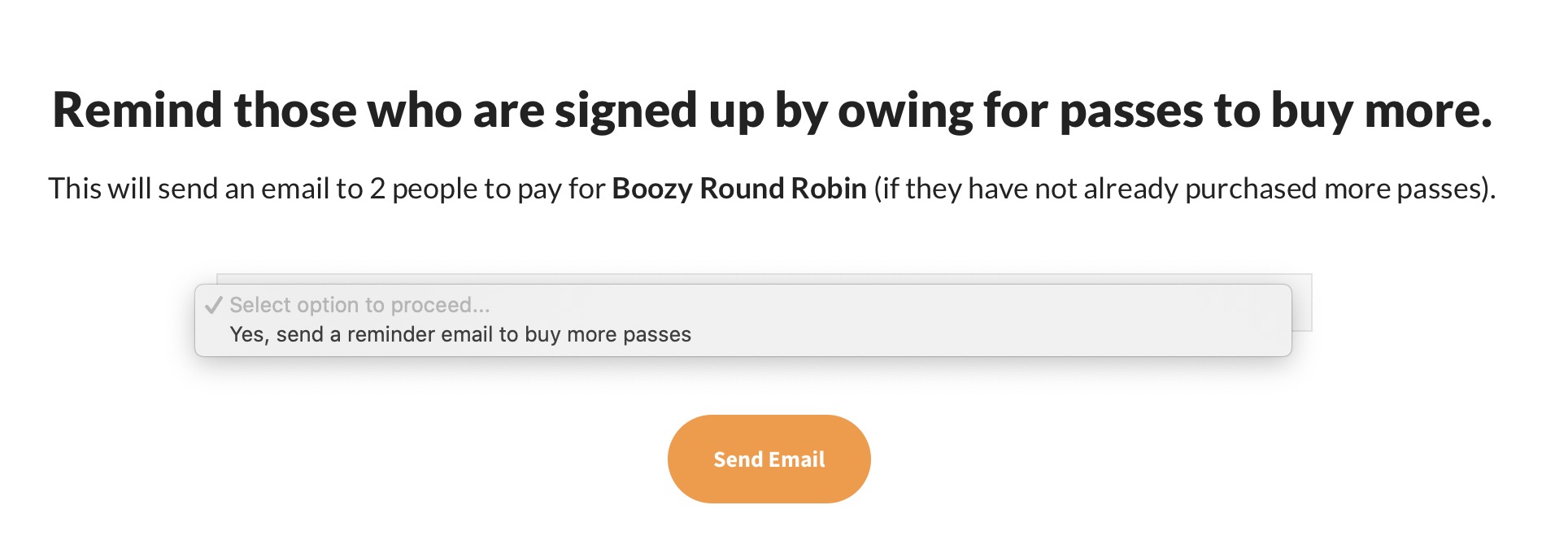 Whoever is managing the Sign-Up can also send a reminder email to anyone that enrolled and chose to owe for a pass at the time…