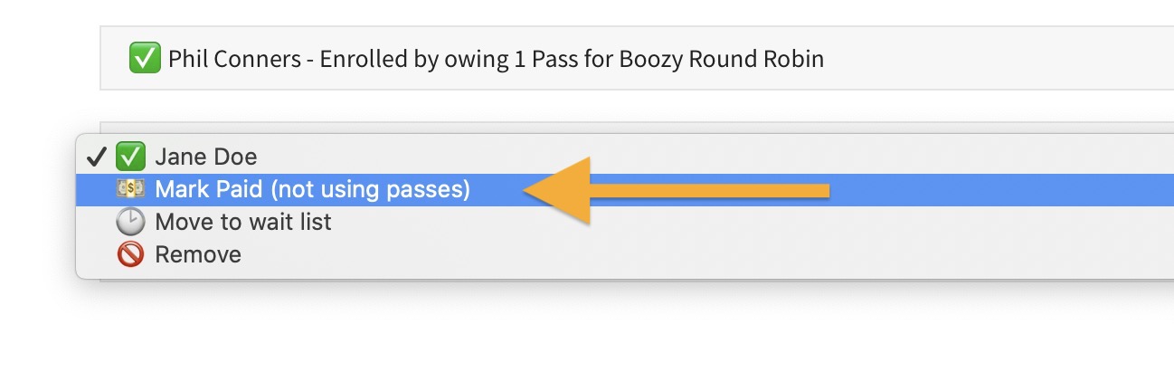 Instead, whoever is managing the Sign-Up can mark them as paid without using passes. This payment could be from the same product that generates passes into a member’s account or it could even be an offsite payment directly to the instructor, for example through Venmo, CashApp, etc.