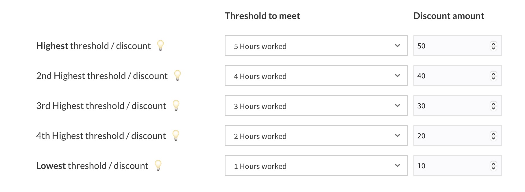The discount amount is a flat dollar amount (not percentage discount) deducted. Your highest amounts must be listed on top descending down to lower amounts.