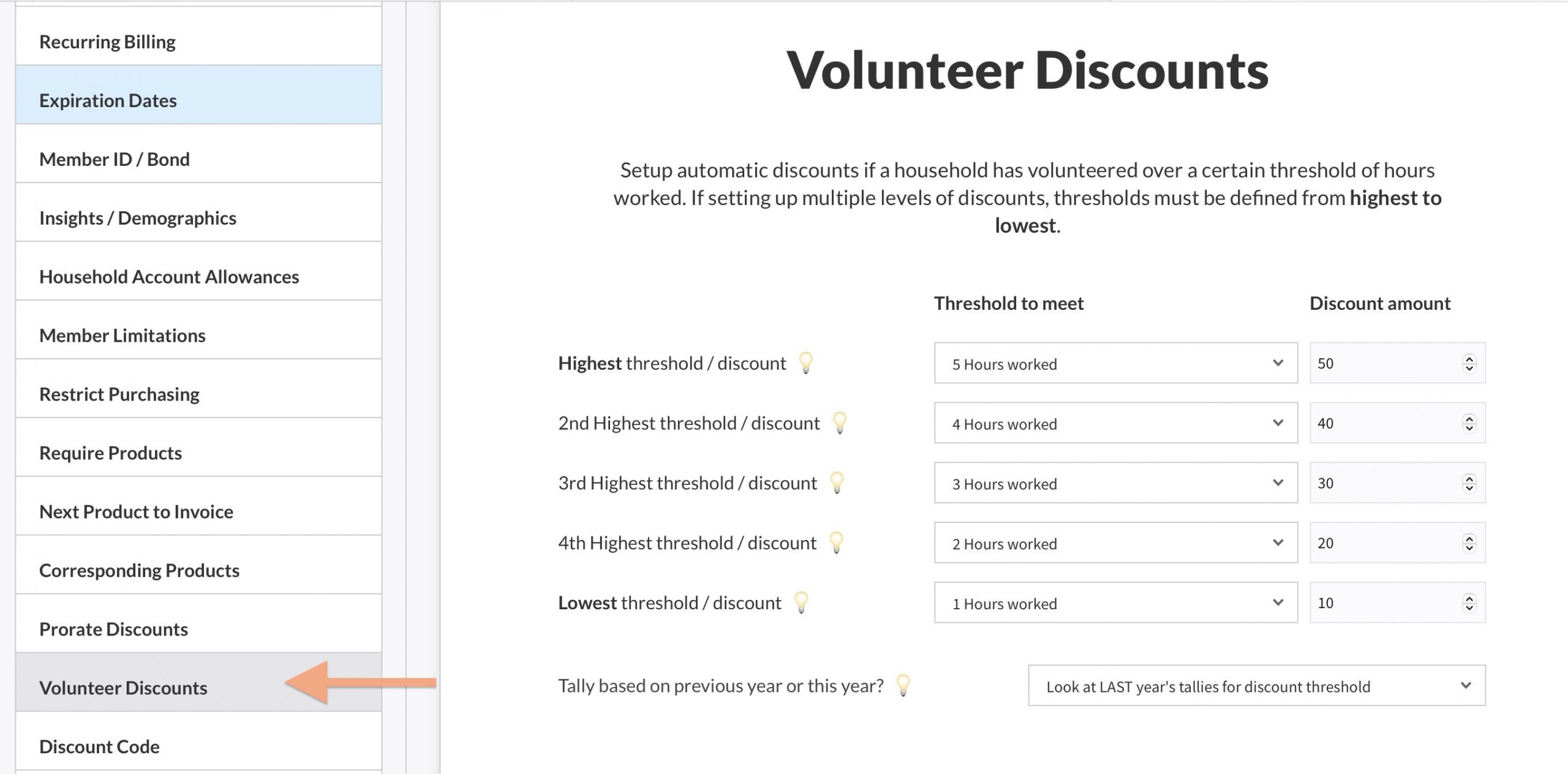 So for example, if the value is set to “Last Year“, and a household worked 5 hours in 2024, they would NOT qualify for any discount when paying in 2024. In 2025 though, their membership would be reduced in price.
