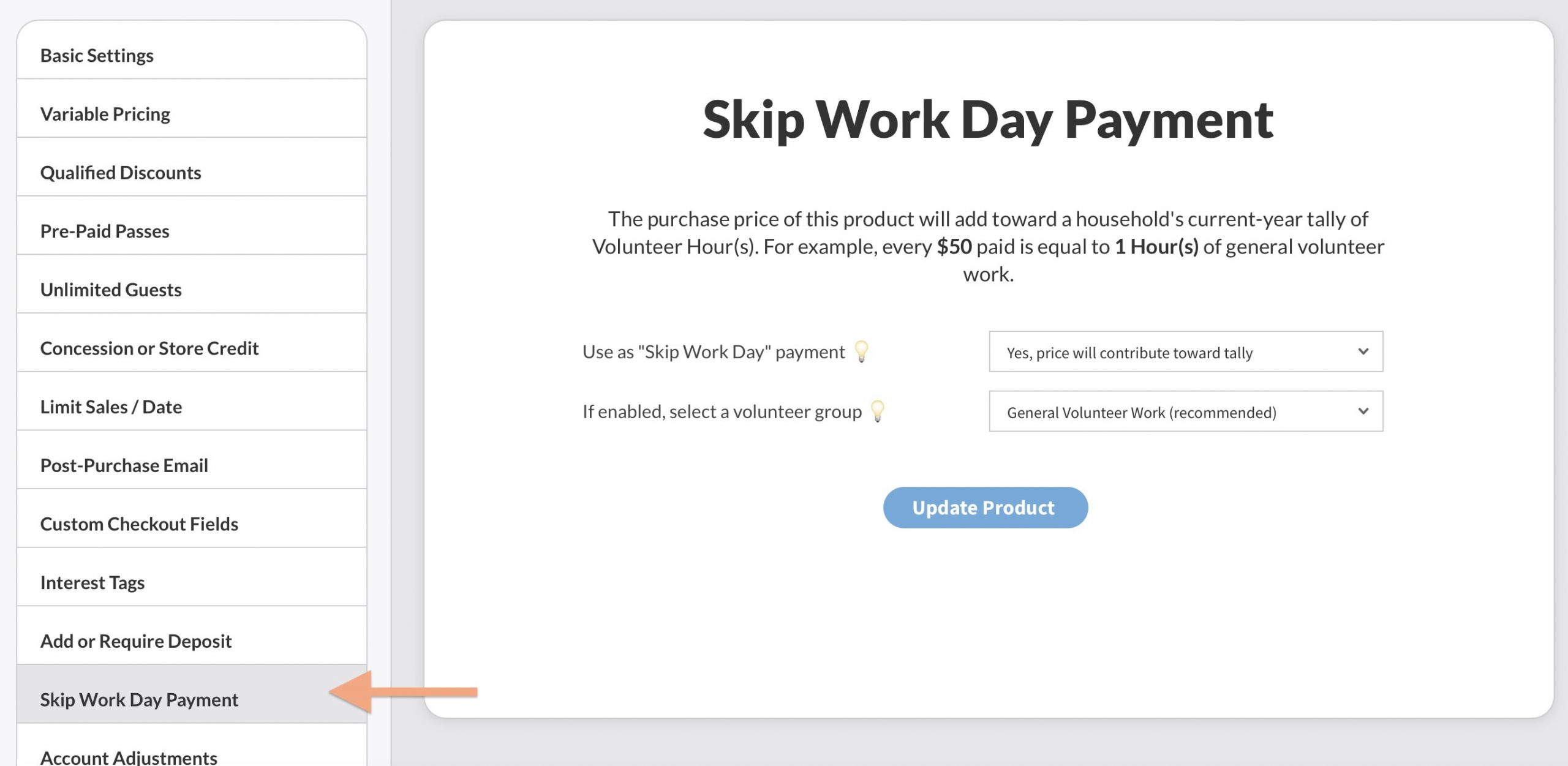 Product payments can contribute to a household’s volunteer tally. So for example, if your facility requires 2 hours of volunteer time to be worked each year, but allows members to pay $100 to get out of working, here’s how to set that up.