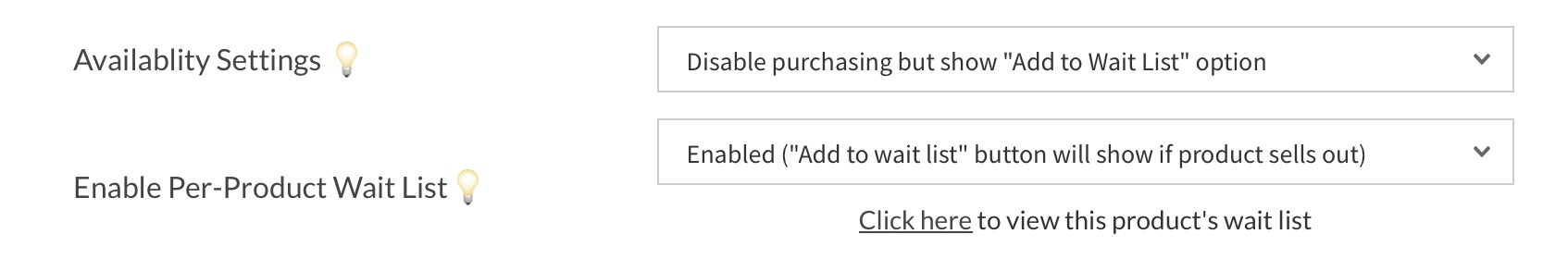 The Availability Settings are an important companion setting because generally a product that never sells out, will not ever need to show the “Add to Wait List” button. So while enabling the wait list, consider at what point you want to start working off your wait list for sales.