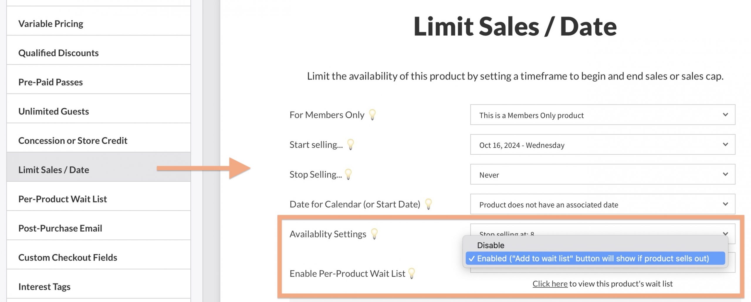 Navigate to the product you would like to turn this feature on for, then head to the Limit Sales / Date section. Under the Availability Settings, you will see the Enable Per-Product Wait List option.