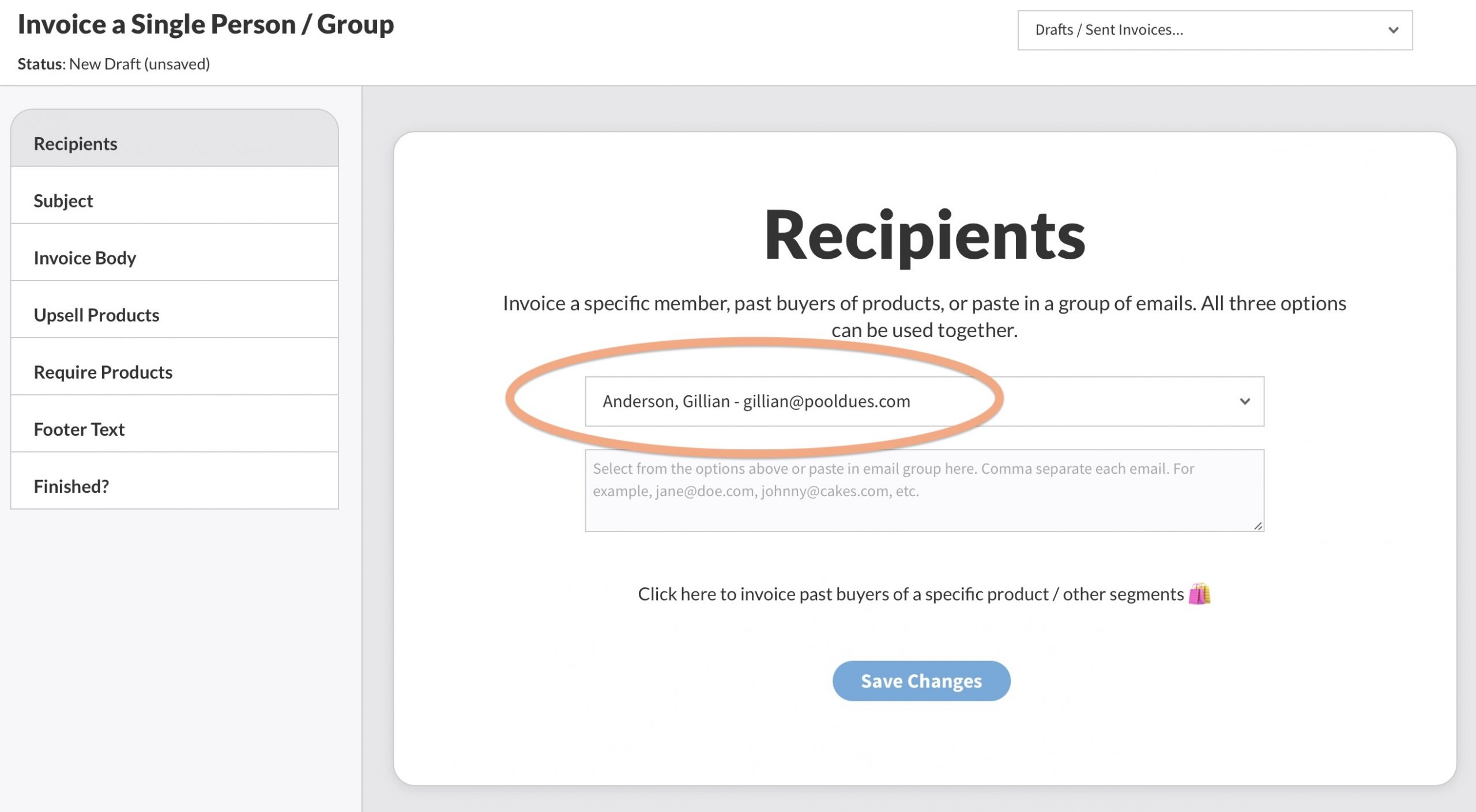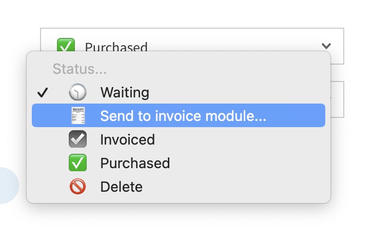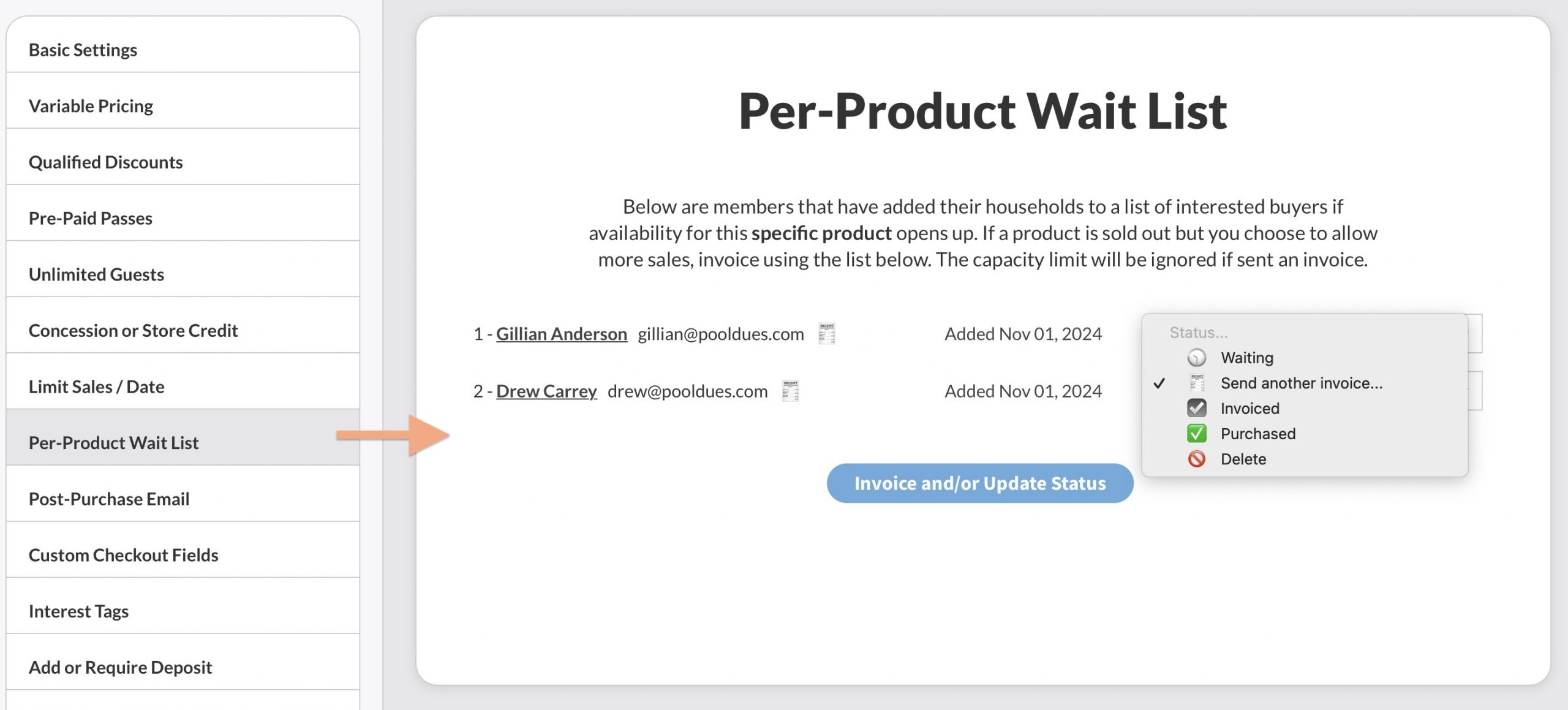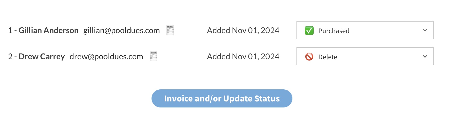 Initially their status will be set to Waiting. When you are ready to send invoices to one or more households, simply change their status to “Send to invoice module“, then click the button below. The households selected to be invoiced will be moved over to the Invoice Module with their emails set as the Recipients and the product pre-selected to be invoiced. Their status will immediately change to “☑️ Invoiced” at this point (so be sure you hit Send on the invoices once in the queue).