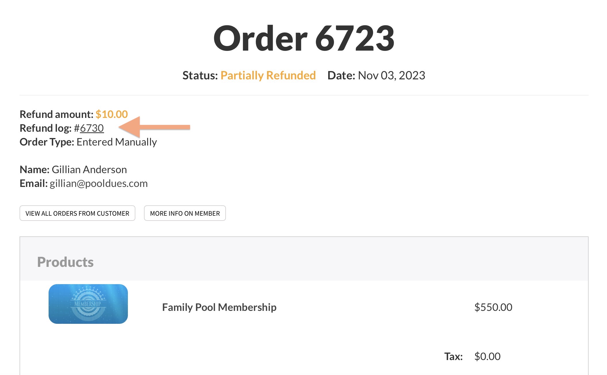 In the screenshot above Order #6723 is the original purchase and the refund log (#6730) is noted at the top of the page. In the unlikely case where an order was refunded multiple times, each log would be listed.