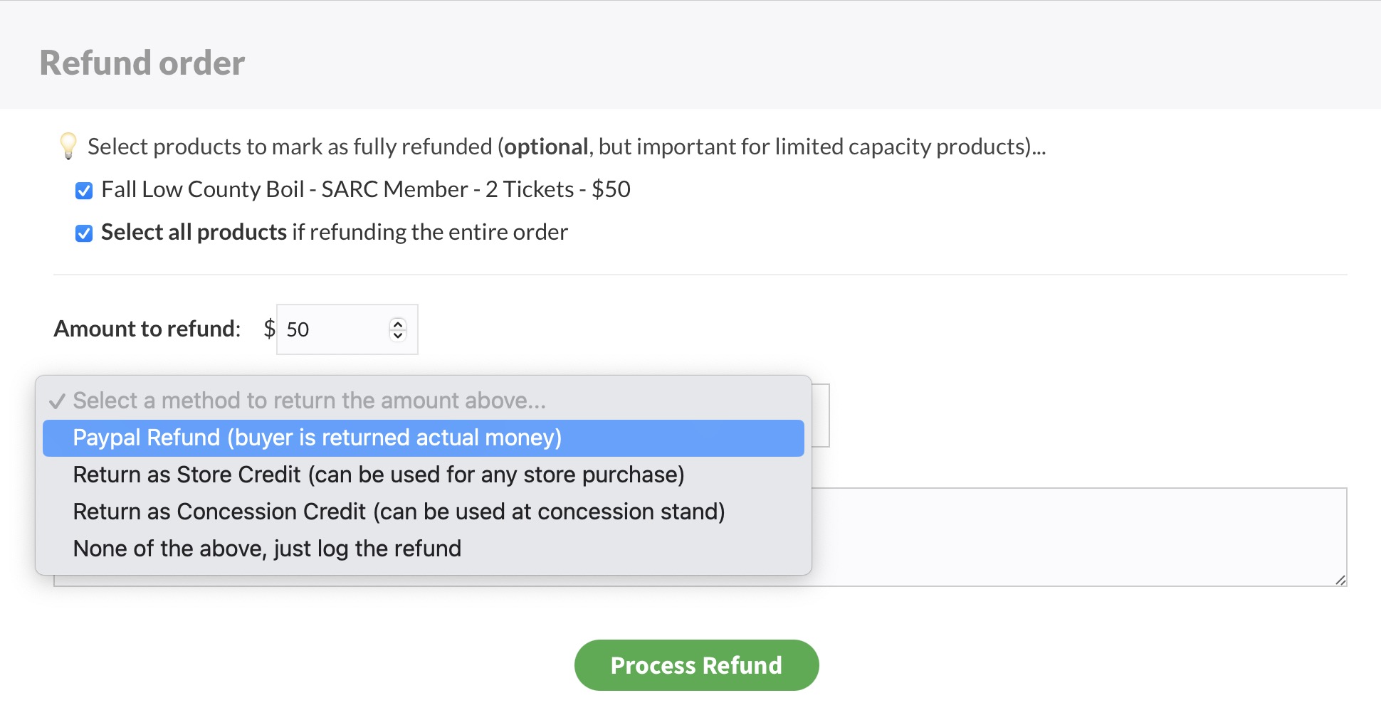Board Members with the “Refund Orders” permission can do so from the Order Details page. Although orders can be initiated from Paypal’s site, doing so from the Order Details pages has some notable benefits. For example, you may want to offer Store Credit or Concession Credit to the member instead of returning actual money.