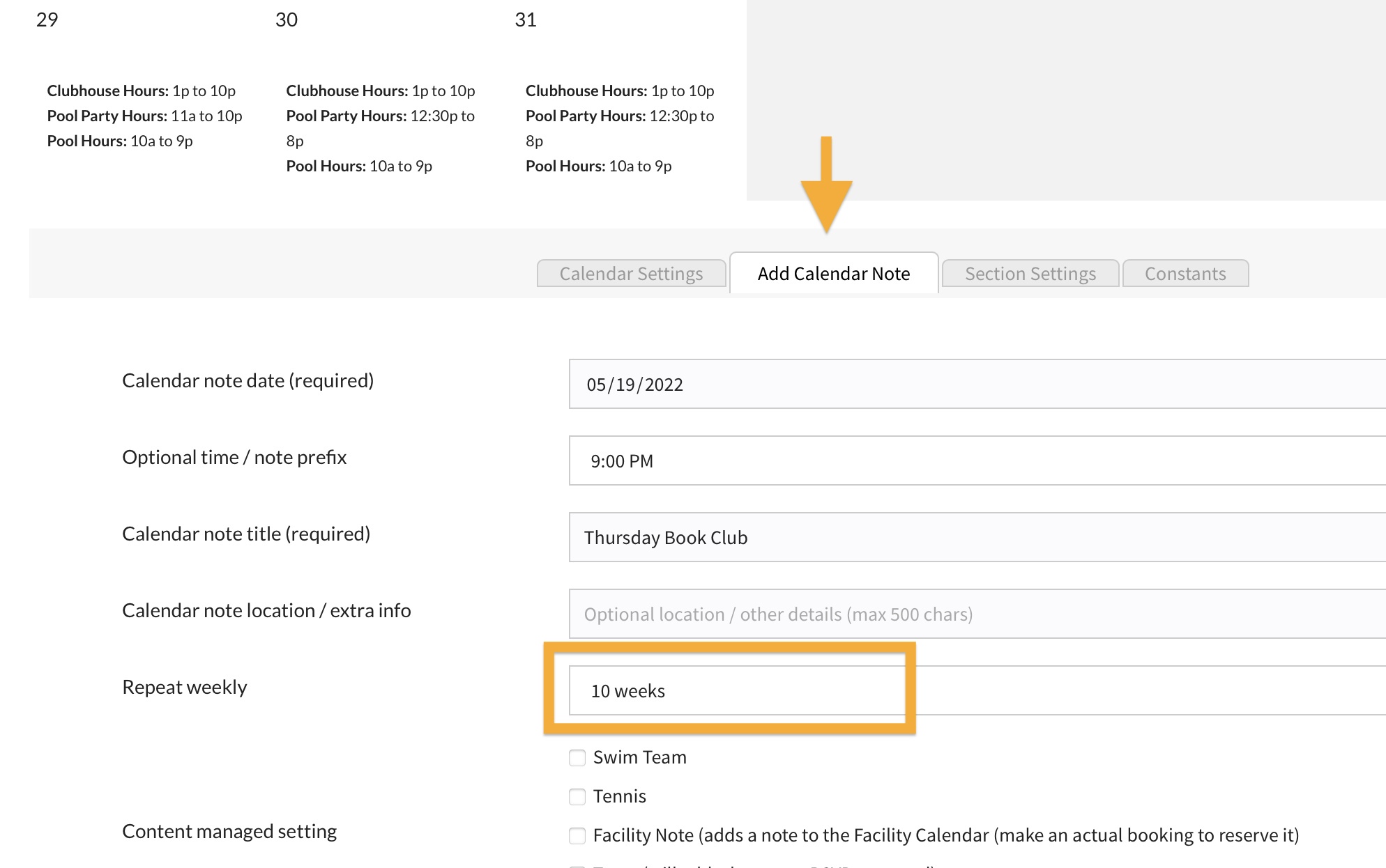 Give your note a title, location (or more short info), start time and you can repeat it for x number of weeks. Notes can also have Content Managed tags, for example “Swim Team”. Again, you can have calendars only meant for groups like Swim Team.
