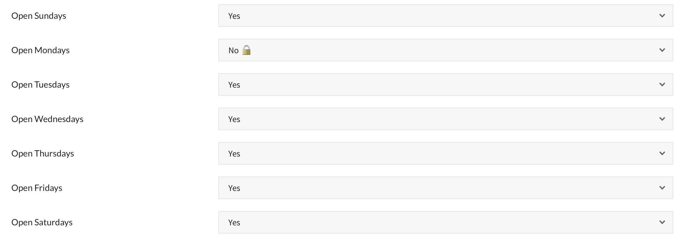 Use the Open <day of the week> fields to override your Open Hours. This is useful if you are using the grid settings and your club’s hours are the same every day but closed on Mondays, or if you’re using the same Open Hours Set for multiple grids, but one or more of them have different days they are closed. For example, you have two pools. You’ve created a Pool Hours Set, but one is closed on Mondays and the other is closed on Thursdays.
