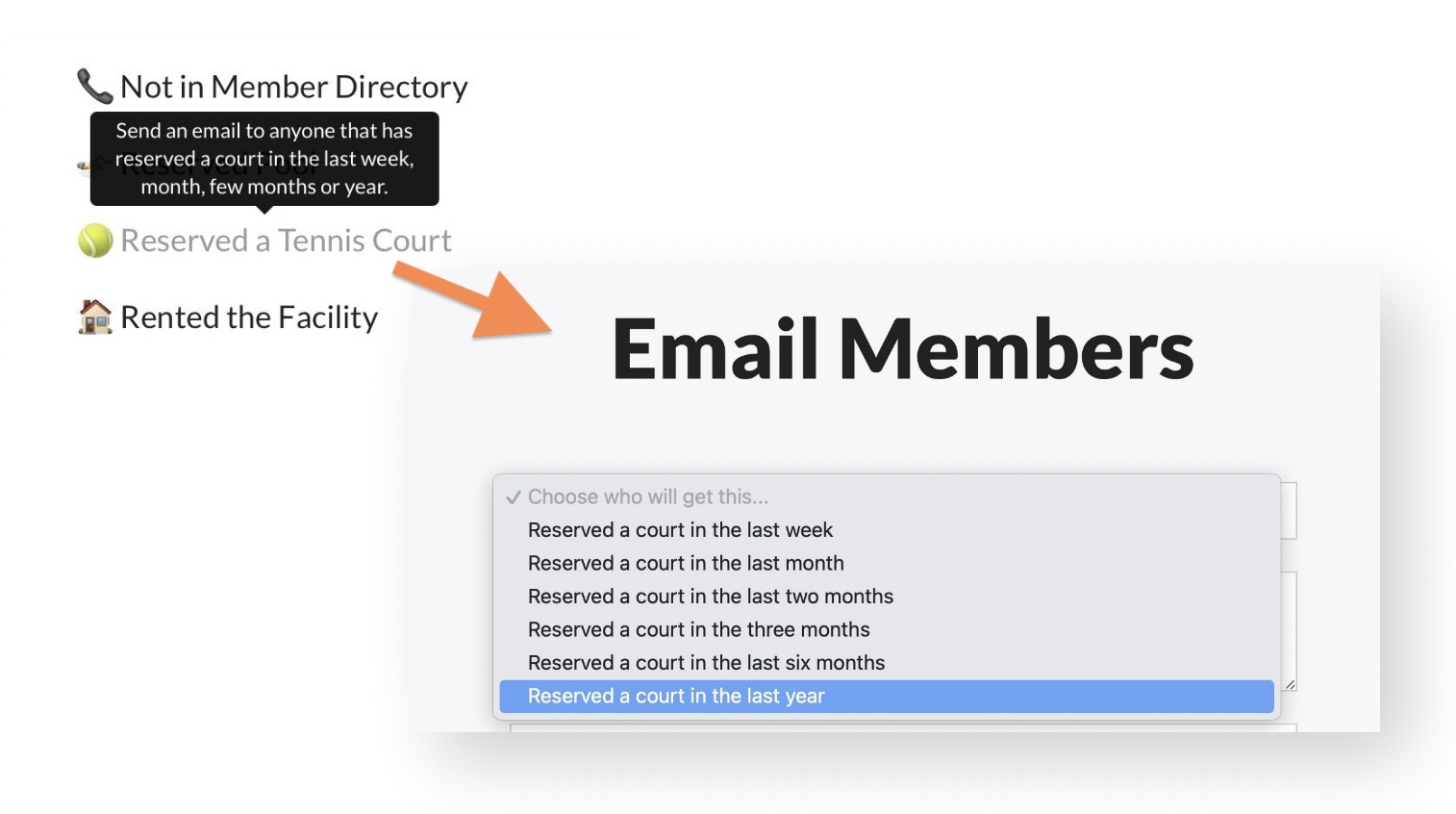 From there, you can choose a timeframe to pick from members that have reserved a court. We recommend anyone that has a reserved a court in the last year.