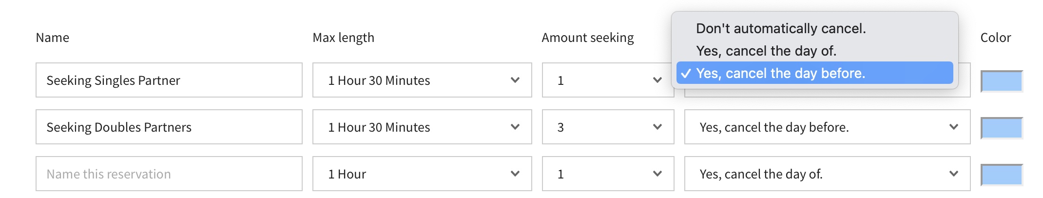 These reservation types can optionally be set to automatically cancel the day of or the day before if the reservation has zero participants.