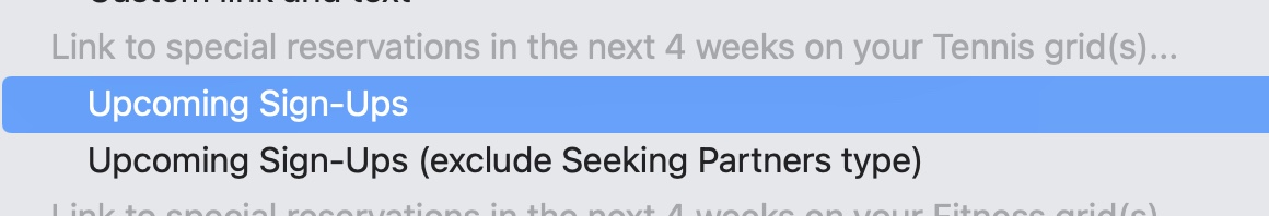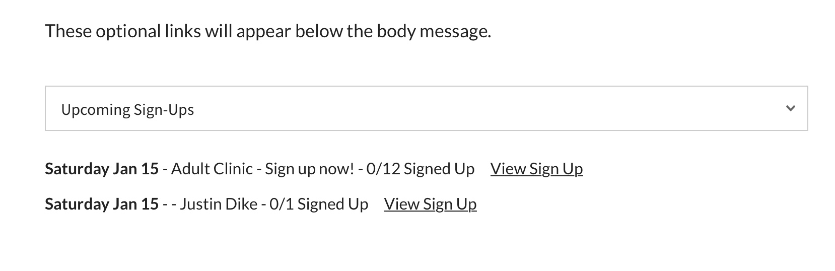 Again when composing an email, another option in the dropdown menu below the Body Message is to list upcoming “Sign Up” reservations in the next 4 weeks. This could be all clinics that allow sign-up’s as well as seeking partner reservations.