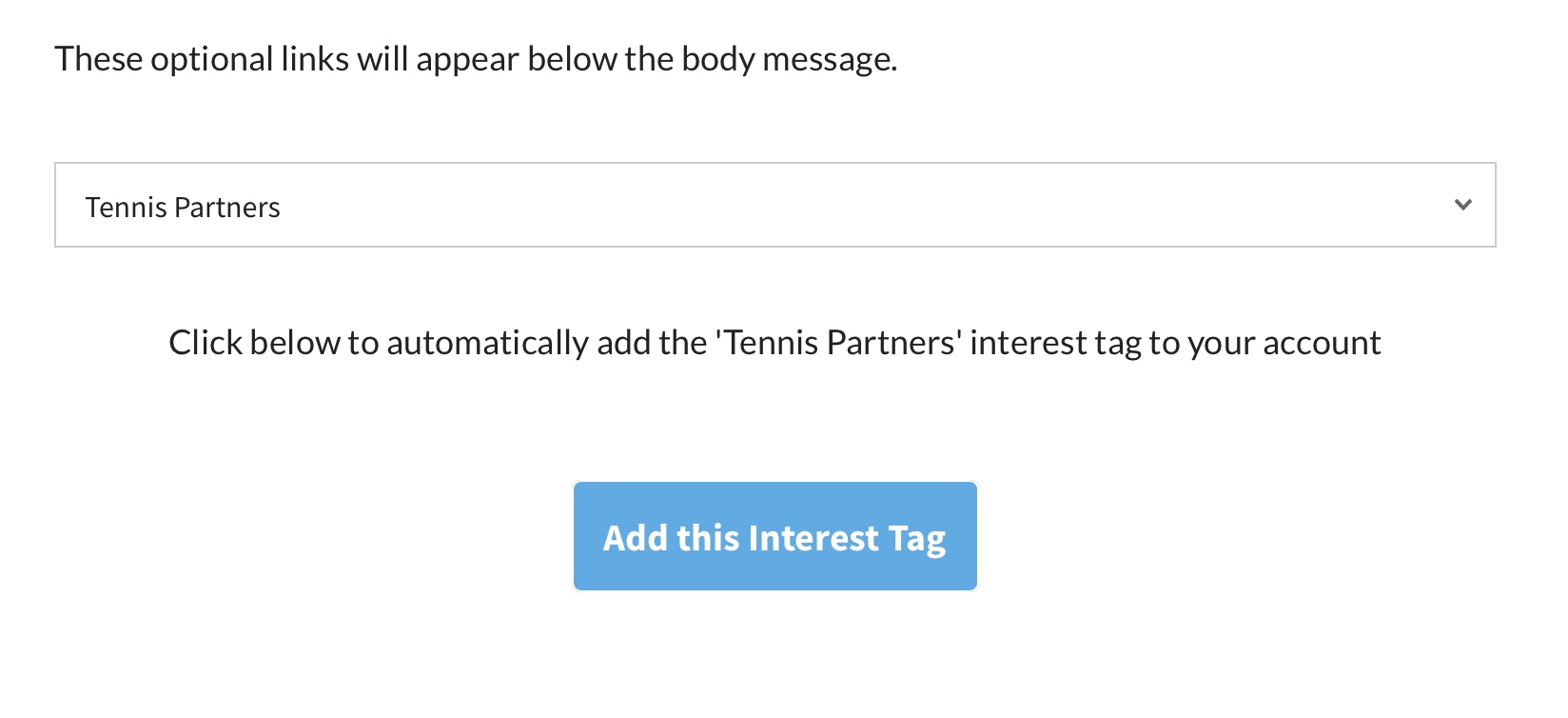 Finish off your email with a link for members to add the “Tennis Partners” interest tag to their account. In the dropdown menu below the body message, select the “Tennis Partners” option (this tag name may be different if you renamed it in your Grid Settings).