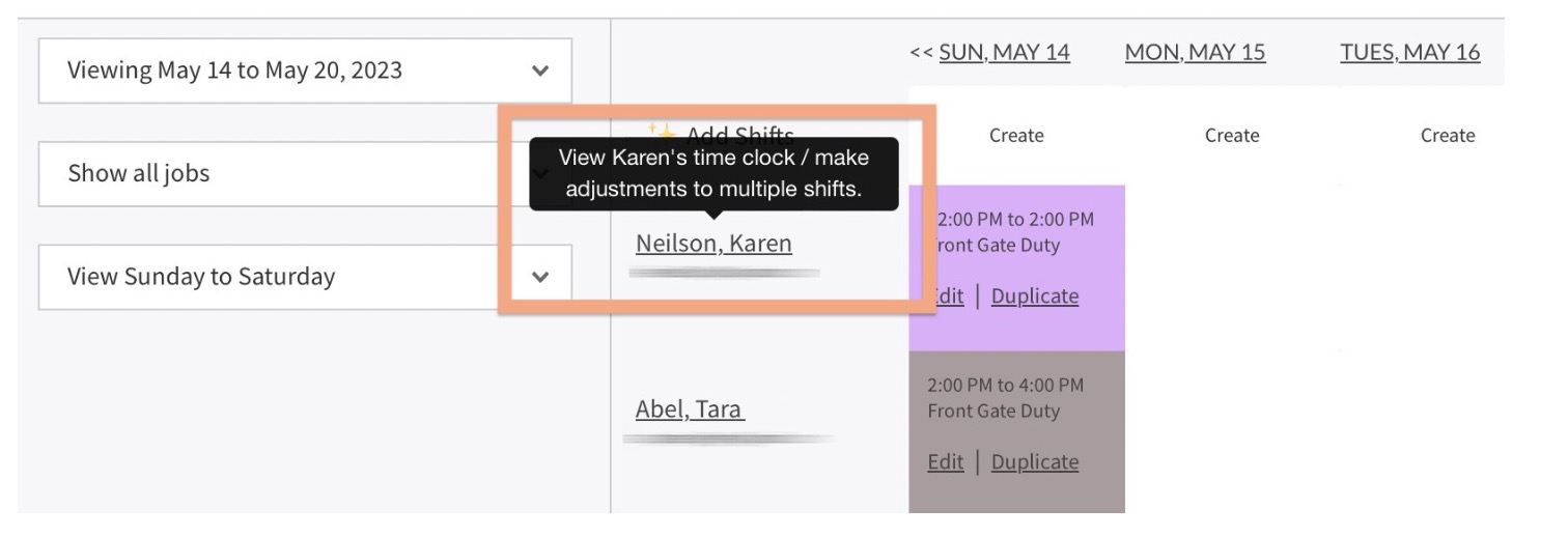 From the weekly view page, your admins can click a specific assignee’s name to view their time clock or adjust multiple shift times at once…