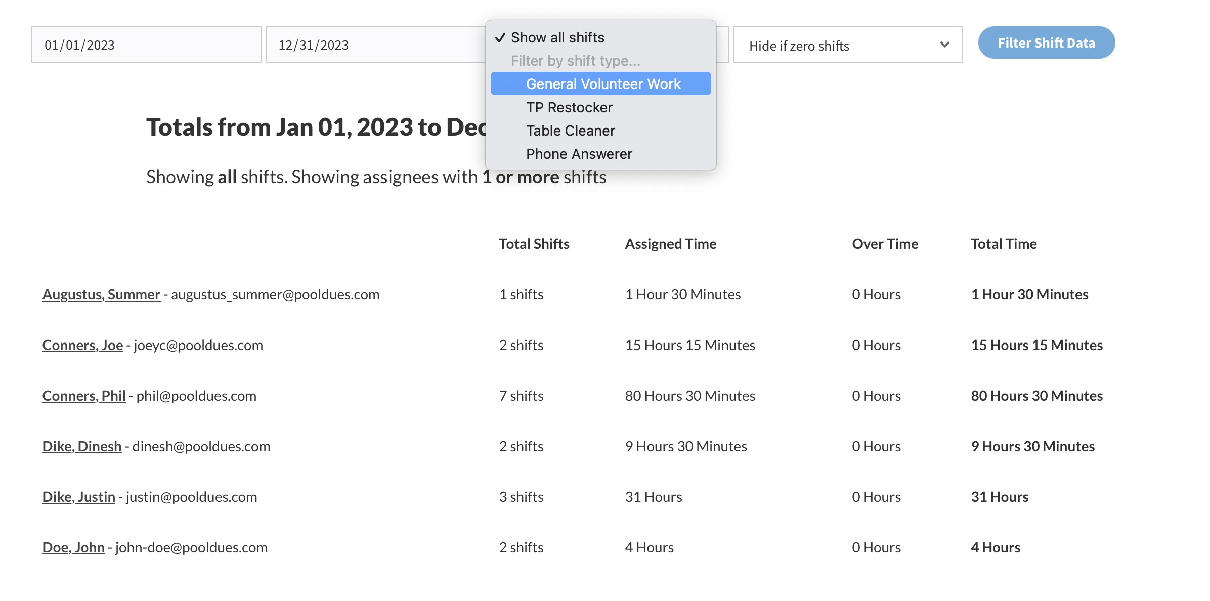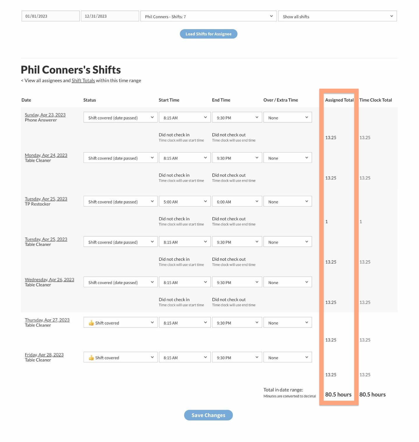 It is also possible to view the shift totals for all assignees within a date range. This page is useful to get an overview of everyone that worked within a certain time period. Clicking an assignee’s name will take you to the Time Clock page (already mentioned above).