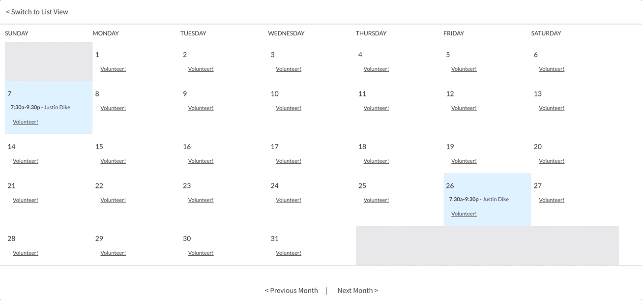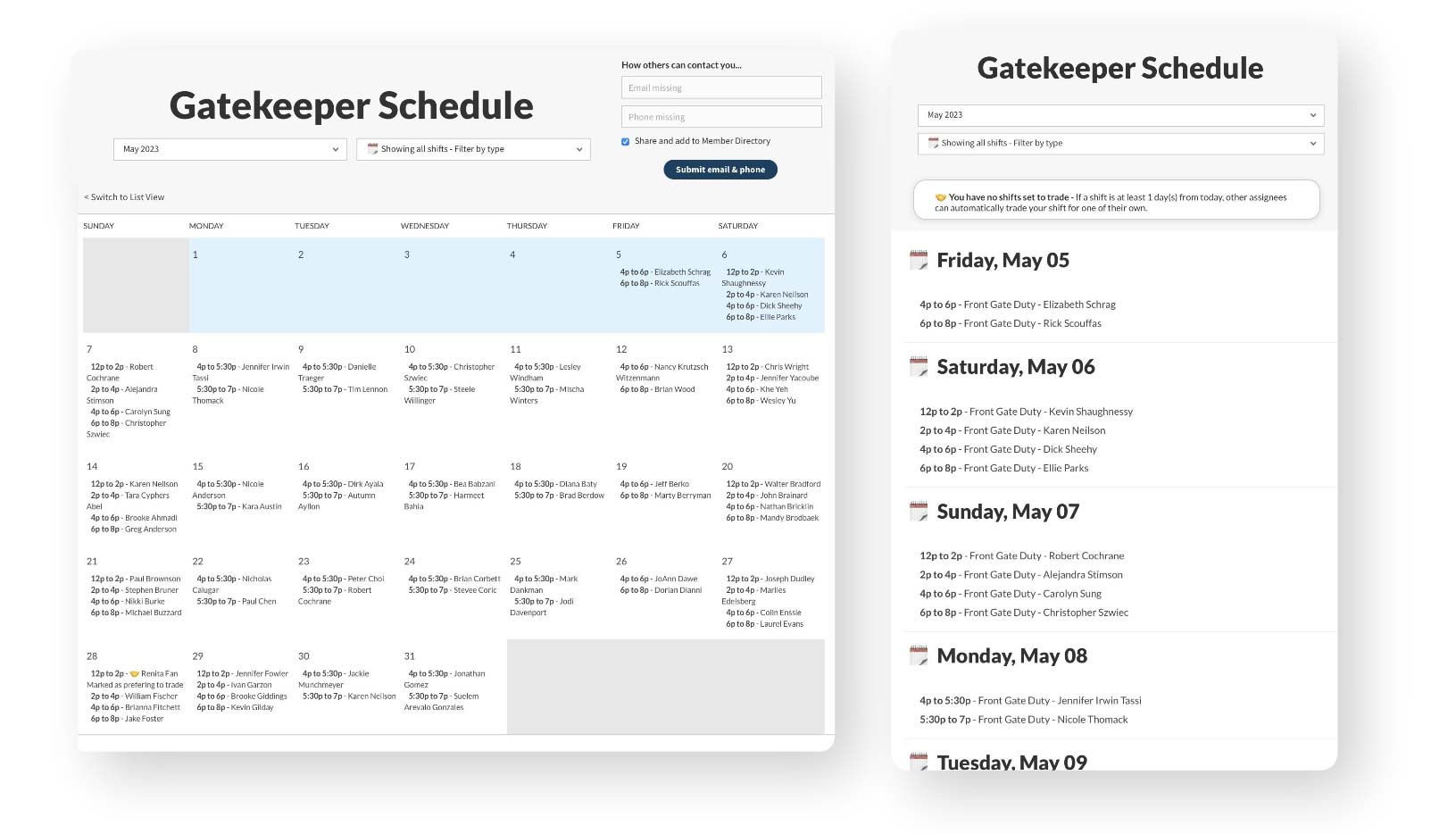 Shift assignees (or potential assignees) can view the upcoming schedule on the calendar you create in either a calendar view or list view. For schedules with daily shifts the calendar view is ideal, for schedules with more sporadic shifts (such as two “work day” weekends) the list view is ideal.