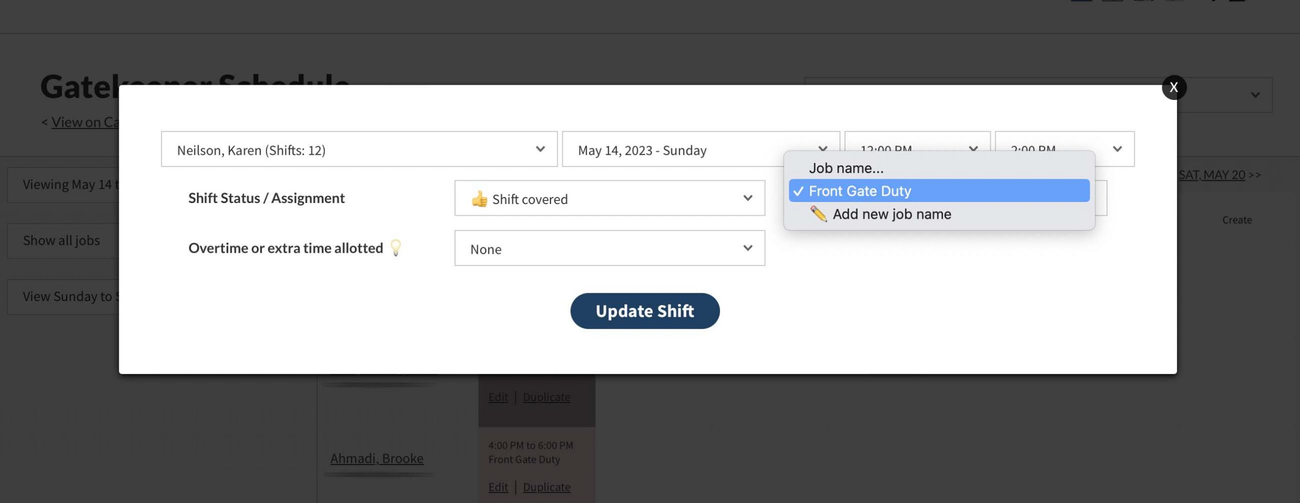 Clicking Edit brings up a window to change who the shift is assigned to, the date, start/end time, overtime, status (for example, “Shift covered”, “Willing to trade”, “Willing to give up”, etc) and the job name. Each calendar can have different job names, so for example you could change an assignee from working “Front Gate Duty” to “Bathroom Cleaner”…