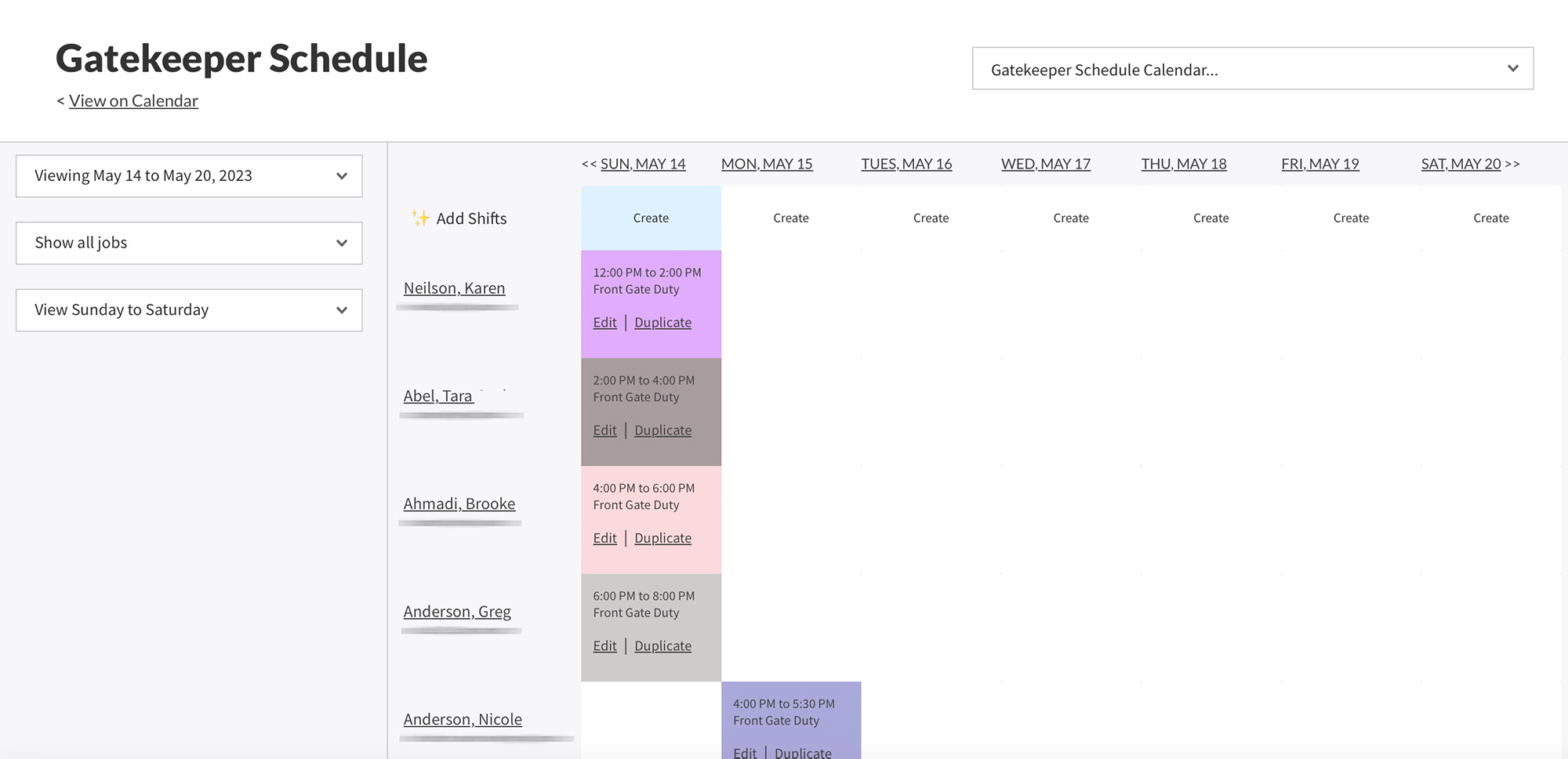 Your staff manager can access a weekly view of upcoming shifts to create new ones, edit / delete existing shifts, or duplicate existing shifts.
