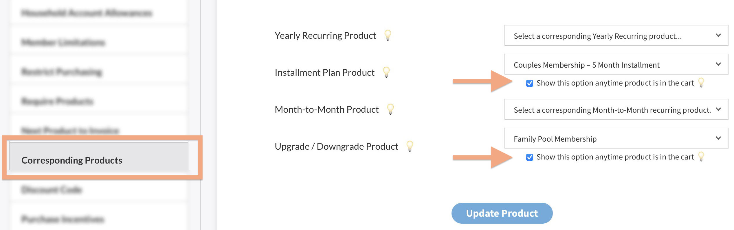 To get started go to the Board Dashboard > Financial Dashboard then Membership Products. Click a specific product, then go to the Corresponding Products section. For reference, in the screenshot below we are editing a product called “Couples Membership“. You can see this product has two alternate products already set…