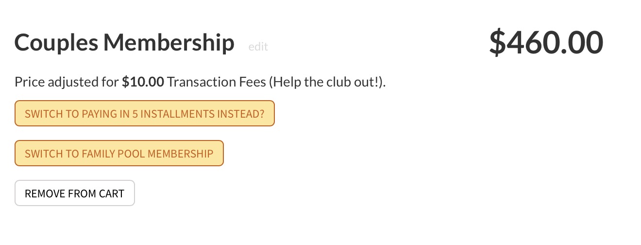 In the screenshot above, notice the Installment Plan Product is set to a product named “Couples Membership – 5 Month Installment” and the Upgrade / Downgrade Product is set to “Family Pool Membership“. Both products have the toggle checked on labeled “Show this option anytime product is in the cart”, so two buttons would show at checkout…