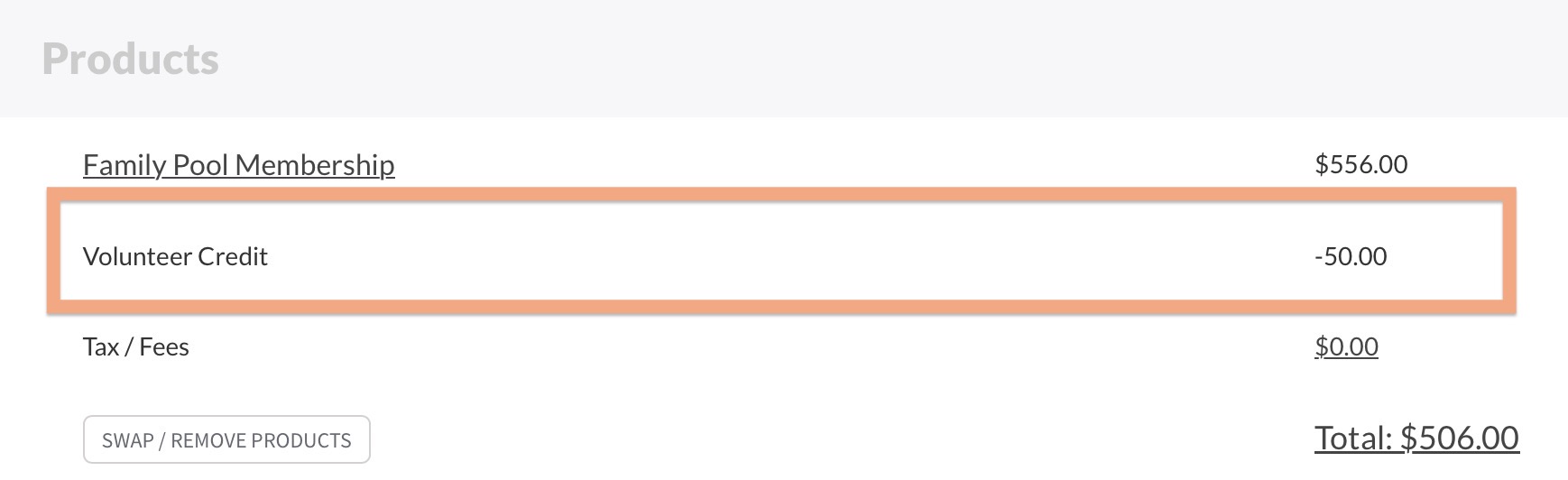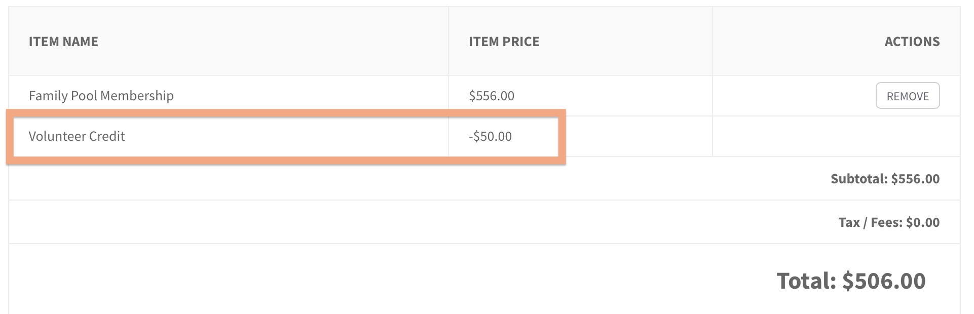 Your club can set a Volunteer Credit amount in a member’s profile to automatically subtract from the final price of their annual dues. This credit will appear at checkout like so…