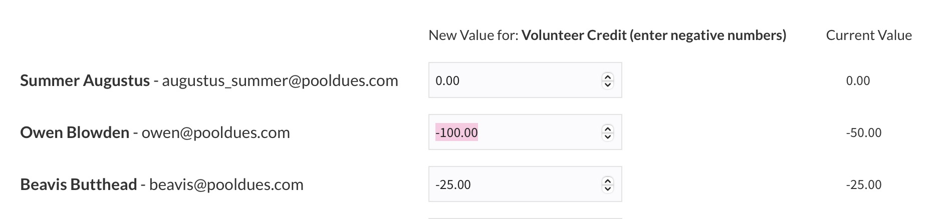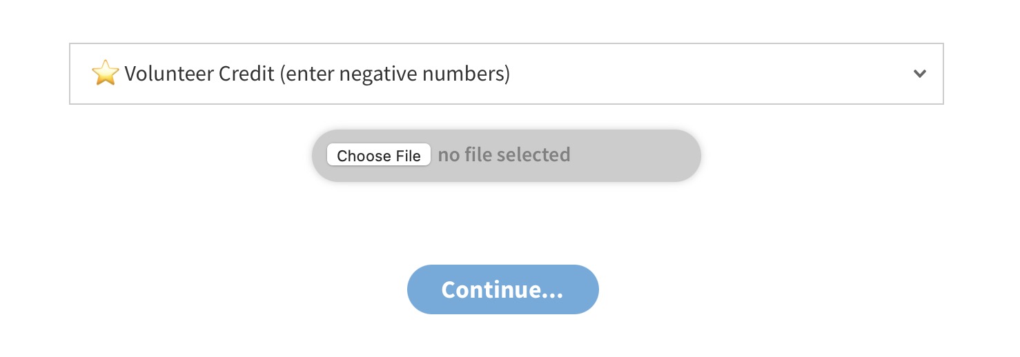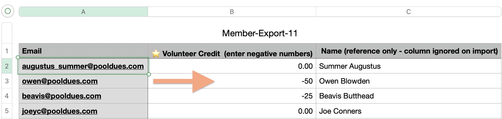 Open the CSV file in Excel or Numbers. Make changes to the second column. A value of 0 means the member has no Volunteer Credit. Negative numbers, such as -50 would mean the member will get $50 off at checkout. If you forget to enter a negative number we will correct this for you when the data is re-imported.