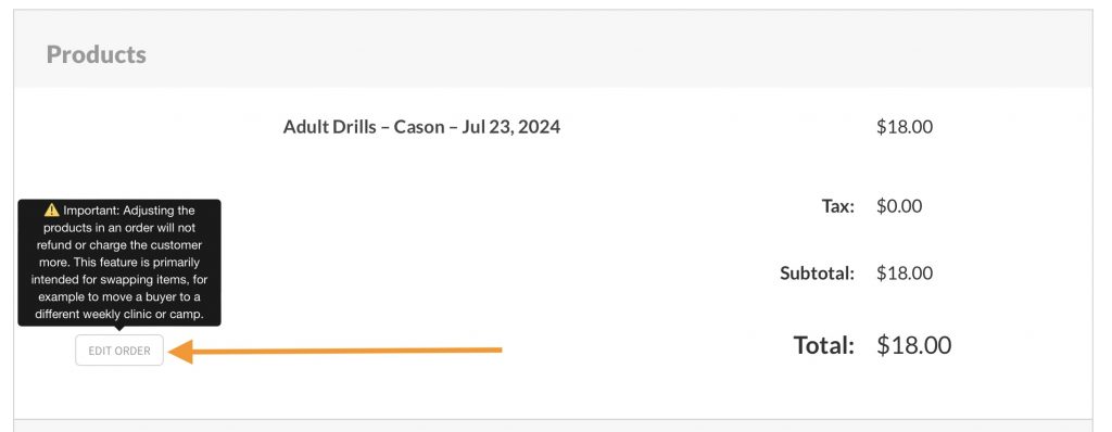 This feature is primarily intended for swapping items of the same price, for example to move a buyer to a different weekly clinic or camp. If your product has limited capacity, the system will make the appropriate subtraction/addition for those class/clinic/camp numbers.