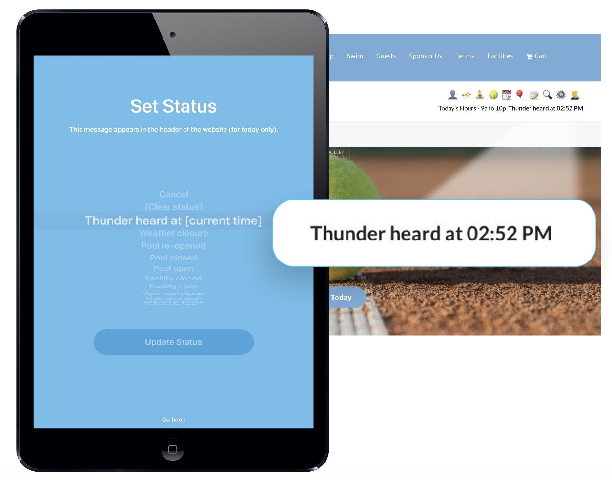 As of version 9.26 of our Front Desk Attendant app, each iPad can enable (or disable) updating the front page header of the website. These preset messages can be used to post thunder closures, late arrivals of guards, slide / diving well closures and much more.