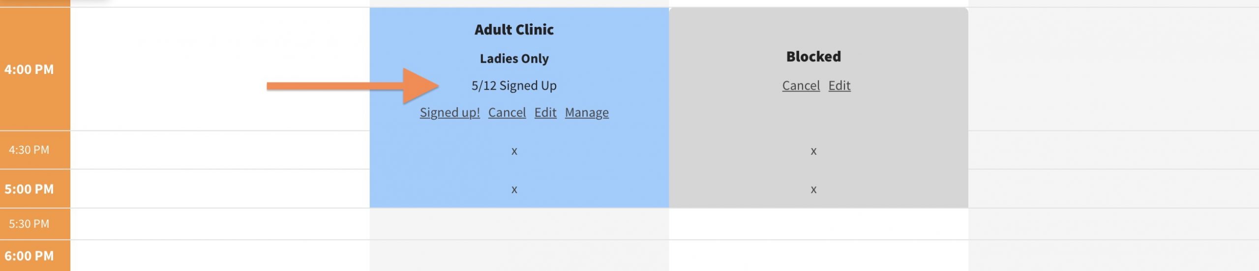 In the example image above, the list view of upcoming tennis clinics is on the left. Members can scroll down that page and see a list of every Sign-Up. This page also has a link to a calendar view of upcoming Sign-Up’s. Read here for help finding the list view link.