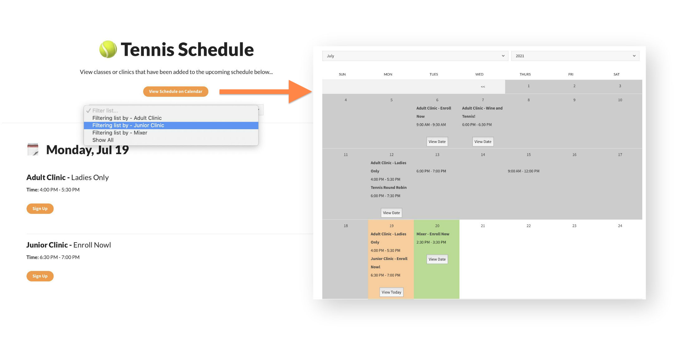 Notice the list view has pulldown options to filter customizable types of clinics / classes, like Adult Clinic, Junior Clinic. These titles are set in the reservation grid’s settings.